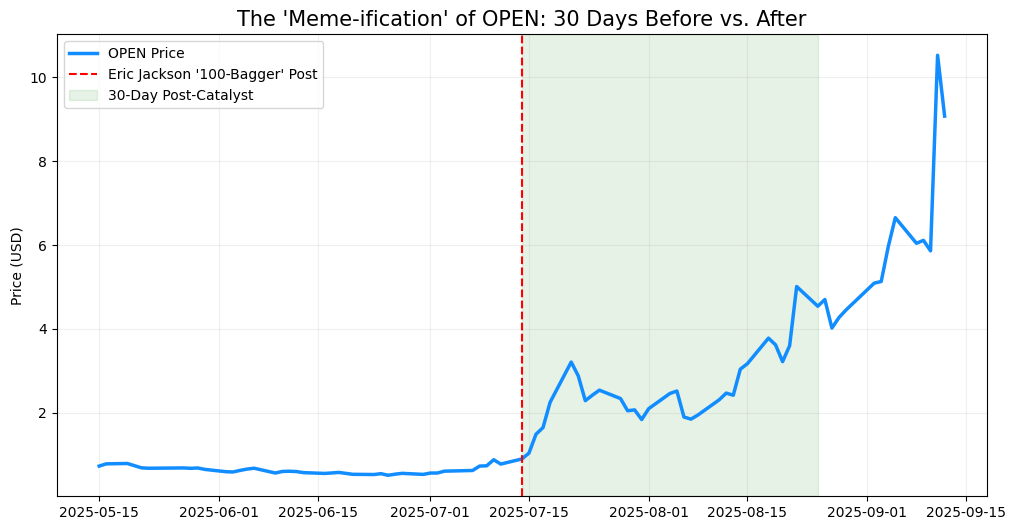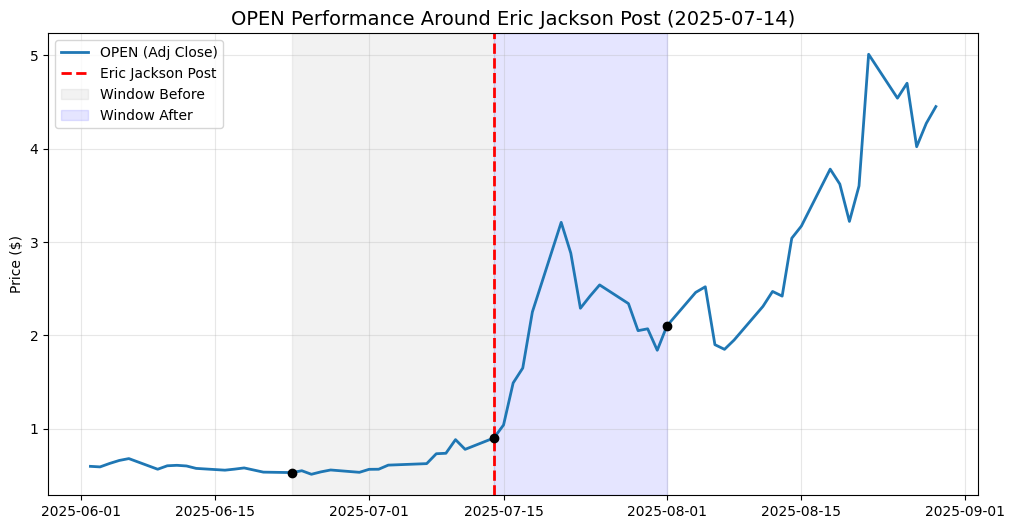 This chart shows how Opendoor (OPEN) behaved in the 30 trading days before and after a key moment: Eric Jackson’s public post on July 14, 2025, where he shared a very bullish view on the stock.