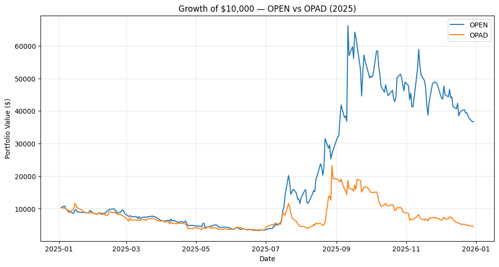 Growth of $10,000 in 2025: OPEN vs OPAD