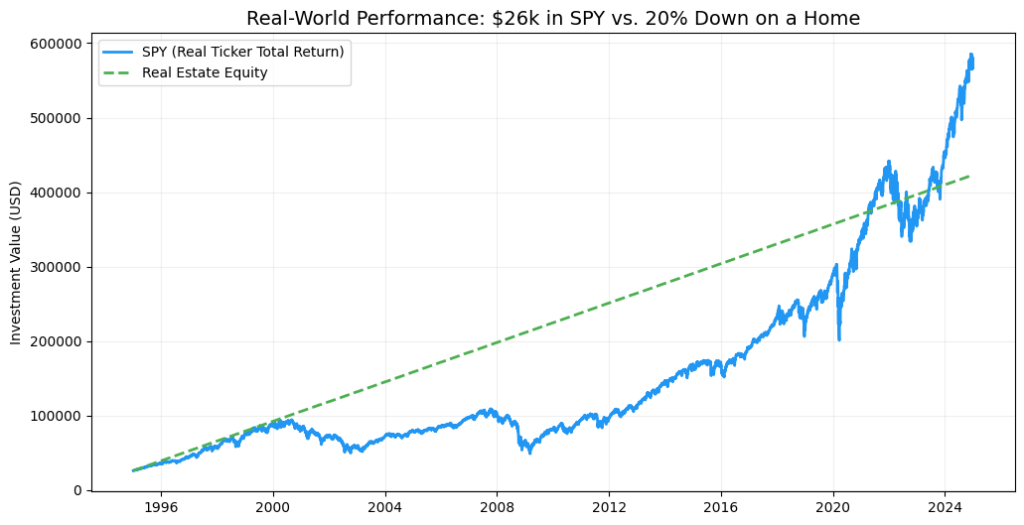 The chart below shows what actually happened when we put $26,000 into the S&P 500 versus using $26,000 as a 20% down payment on a home, starting in 1995 and running through 2025. The stock line includes dividends reinvested, while the home line shows how home equity grew as prices increased over time.